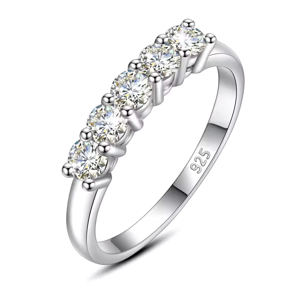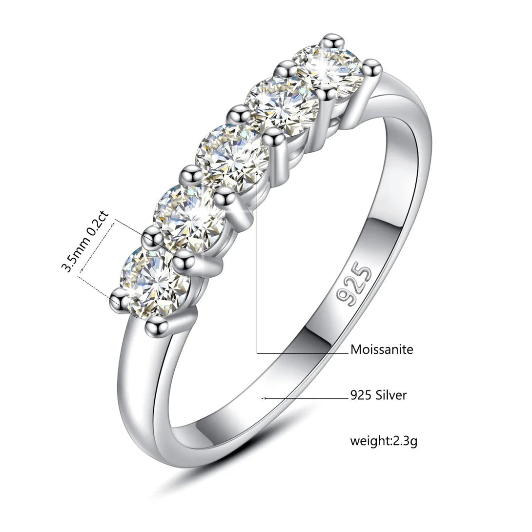 This gorgeous 5-stone band delivers the brilliance of a diamond without the price tag. Featuring five 0.2ct Moissanite stones (1.0 CTW), it offers unparalleled sparkle and fire. The durable 925 sterling silver base is lavishly finished in your choice of Rose, Yellow, or White Gold plating, making it a perfect, meaningful accessory for daily wear or your special day.