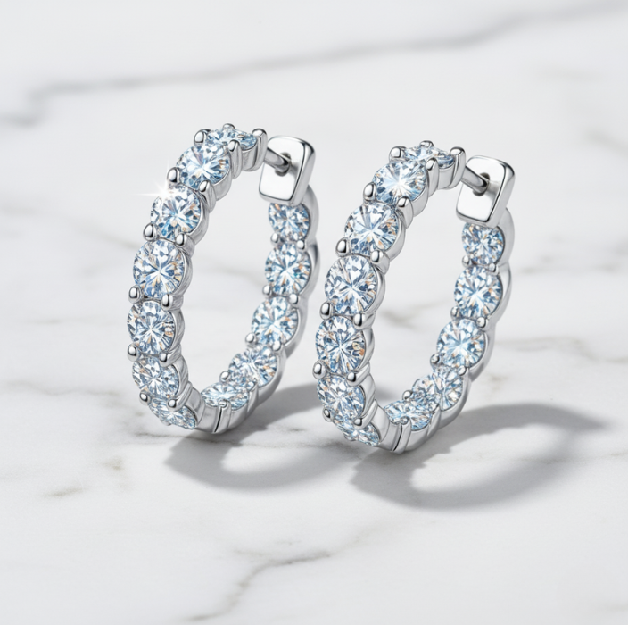 Crafted from S925 sterling silver plated with 18K white gold, these hoops feature dazzling D Color VVS1 Moissanite stones that radiate unmatched brilliance. Lightweight, hypoallergenic, and stylish, they’re perfect for daily wear, weddings, or special events, adding a touch of refined sparkle to any look.