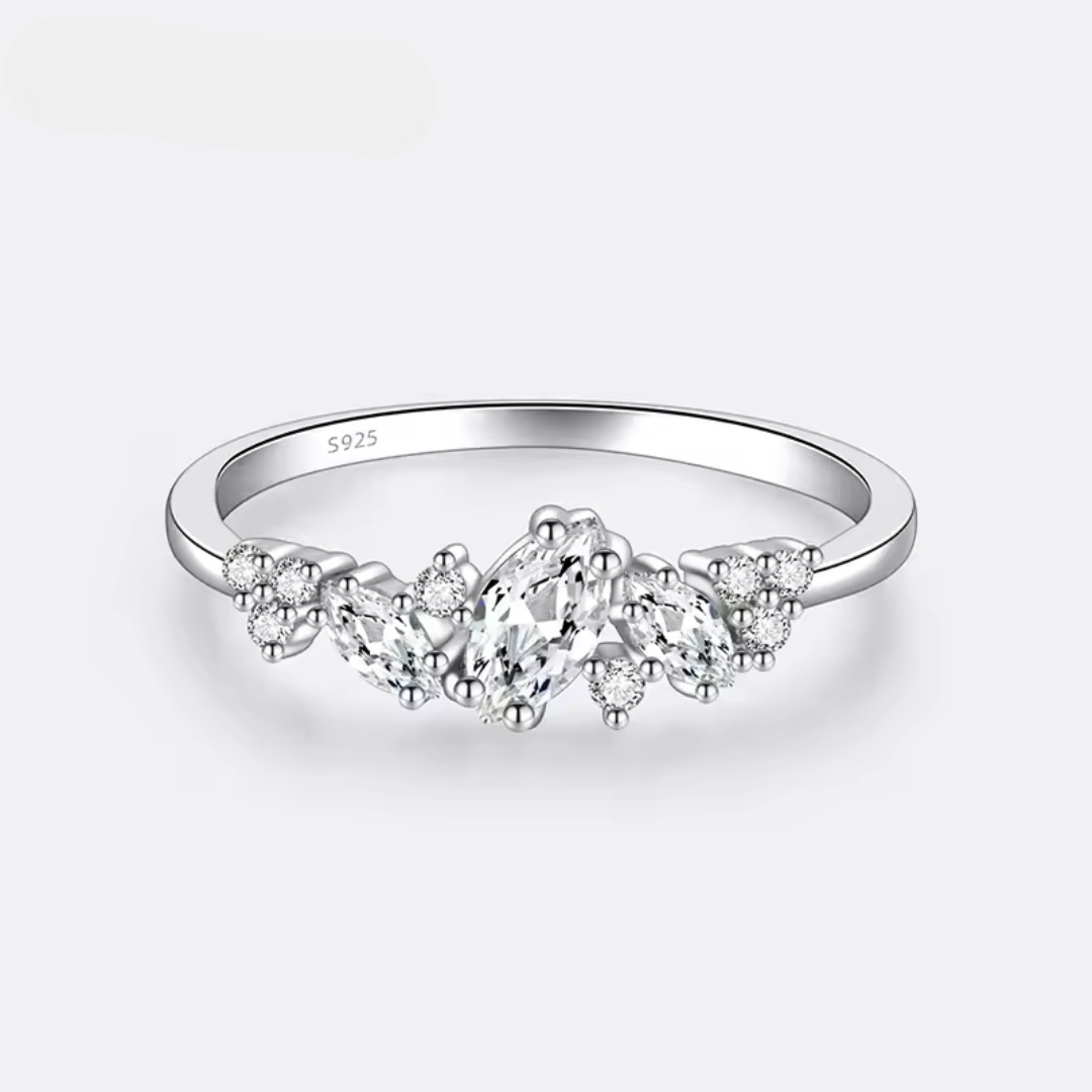 This stunning ring features brilliant, lab-cultivated Marquise Cut Moissanite for that breathtaking sparkle that's as pure and flawless as a high-quality diamond. The setting uses a classic, durable Prong Setting, just like a crown, ensuring each stone is held securely while offering a gorgeous, high-end design crafted from safe, genuine S925 Pure Sterling Silver.