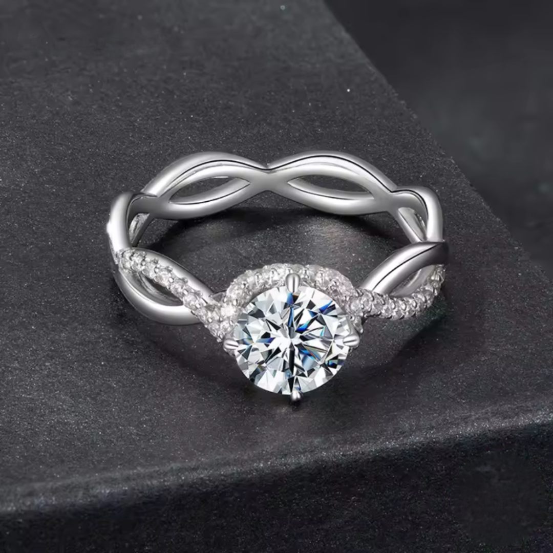 This stunning Retro Lace Twisted Ring features brilliant 1ct D Color VVS1 Moissanite, which is known for its superior fire and brilliance that far exceeds that of a diamond. Crafted from strong 925 Sterling Silver, the elegant twist design makes this statement band durable, incredibly comfortable, and a tremendous value, giving you eternal elegance at a fraction of the cost.